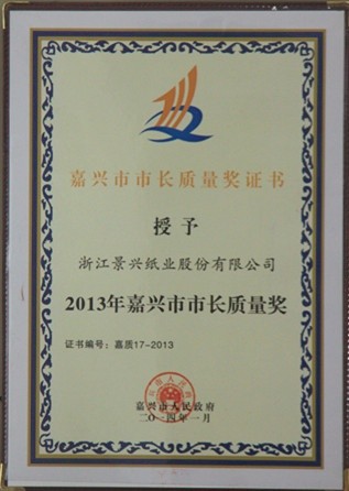 Jingxing Paper won the "2013 Jiaxing Mayor Quality Award".