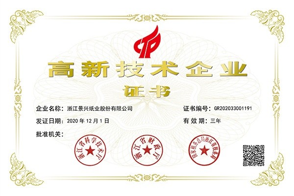Jingxing Paper Industry relies on technology, strives for survival through quality, competes for the market with service, and seeks development through efficiency. It has successively been awarded as a National High-tech Enterprise, one of the first batch of national "resource-conserving and Environment-Friendly" pilot enterprises, a National Green Factory, a National Water Efficiency Leader among Key water-consuming Enterprises, the first certification unit for National Pollutant Discharge Reform, an Outstanding Private Enterprise in China, a Leading Packaging Enterprise in China, a National Demonstration Enterprise for Creating Harmonious Labor Relations, a National Enterprise with Harmonious Labor Relations in the Papermaking Industry, and Honors such as National Contract-abiding and Creditworthy Enterprise, Zhejiang Province Civilized Unit, Zhejiang Province Four-star Environmental Protection and Integrity Enterprise, Zhejiang Province Well-known Business Name, Zhejiang Province Key Enterprise Research Institute, Zhejiang Province Intelligent Factory, Zhejiang Province Future Factory Pilot Enterprise,Key industrial Internet platform of Zhejiang Province, and Zhejiang Province Clean Private Enterprise It was also the first among its peers to pass ISO9001 Quality Management System, ISO14001 Environmental Management System, ISO45001 Occupational Health and Safety Management System, ISO50001 Energy Management System, FSC® Forest System, Two-in-One Integration Management System, AEO Customs, etc.