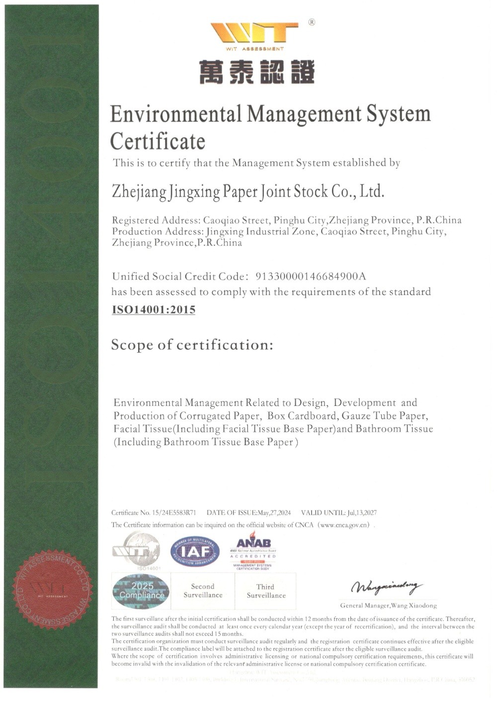ISO14001环境管理体系认证证书英文